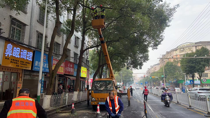 此次整治聚焦桃花路、资江路、文化路、建设路等核心主干道。这些路段部分树木生长旺盛,枝叶遮挡路灯光线,给夜间行人、车辆通行带来不便。为兼顾安全作业与绿化保护,县城管执法局路灯管理所组建专业修剪队伍,避开交通高峰时段施工,作业前设置明显安全警示标志,修剪过程中最大限度保留树木原有形态,在提升照明的同时守护城市绿化成果。
