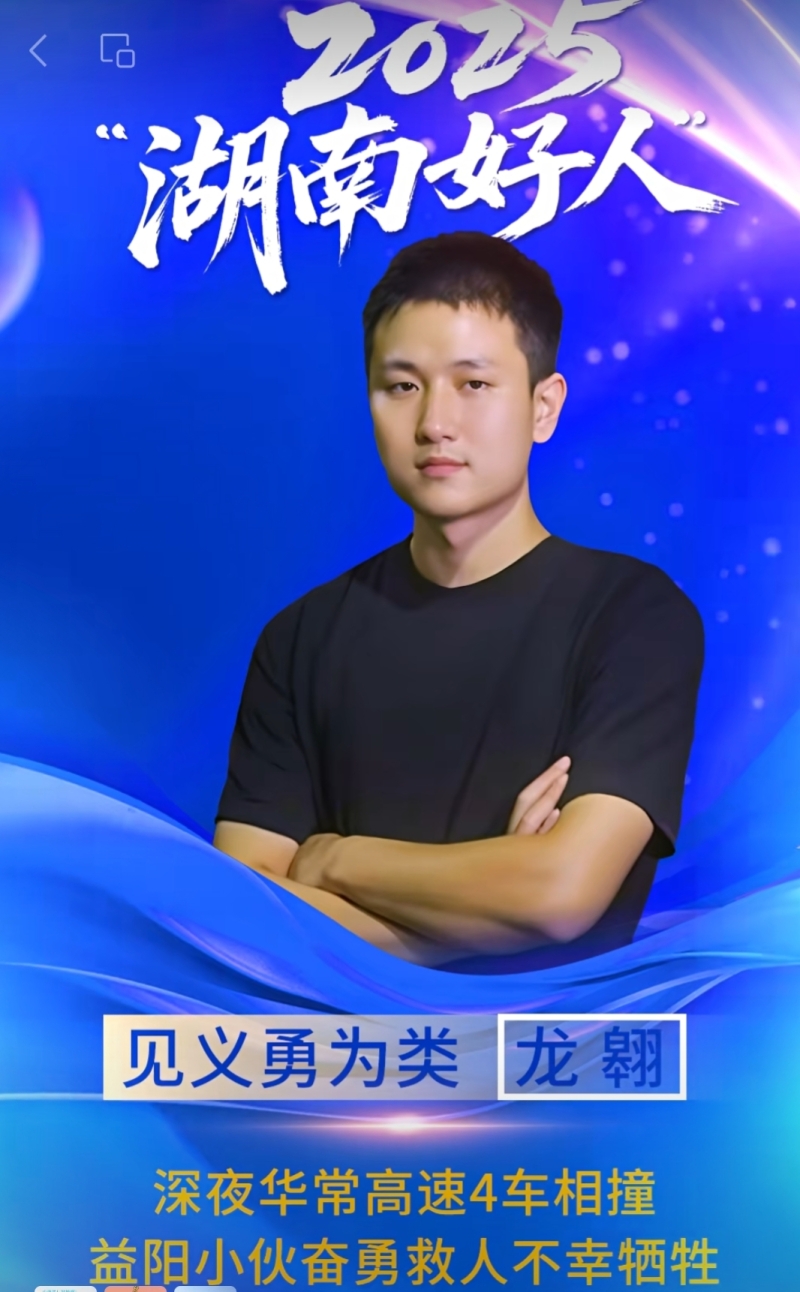 为表彰其英勇义举,2025年9月,中共桃江县委政法委员会决定授予龙翱同志“桃江县见义勇为先进个人”荣誉称号;同年12月,中共益阳市委政法委员会决定授予龙翱同志“益阳市见义勇为先进个人”荣誉称号。前不久,龙翱获评2025年第二批见义勇为类“湖南好人”。