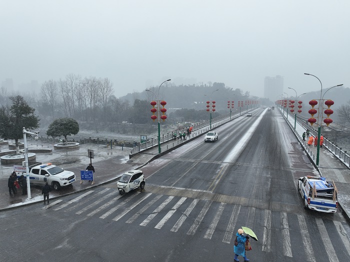 在县城桃花江大道、芙蓉路等主干道,工作人员顶风冒雪,手持扫帚、铁锹奋力清扫路面积雪,为车辆行人开辟安全通道。针对芙蓉桥、牛潭河大桥等5座桥梁及各类上下坡易结冰路段,工作人员采取“人车协同”模式精准开展除冰作业:撒盐车匀速行驶,工业盐均匀铺撒在结冰路面,快速消融冰雪;工作人员踩着积雪,在桥梁两端、坡道路口逐一设置防滑警示标识,醒目提醒过往车辆行人减速慢行。同时,县环卫服务中心聚焦公厕服务保障,在城区各公厕出入口快速铺设防滑垫,有效避免市民因地面湿滑摔倒,同步做好公厕设施防冻维护,确保服务正常运转。