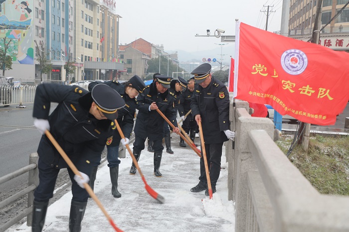 1月20日,低温雨雪天气突袭桃江,县城多条道路出现积雪堆积、路面结冰情况,严重影响市民出行安全。县城管执法局闻雪而动,火速集结,全局干部职工直奔除冰铲雪一线,以实干担当筑牢城市通行安全防线。