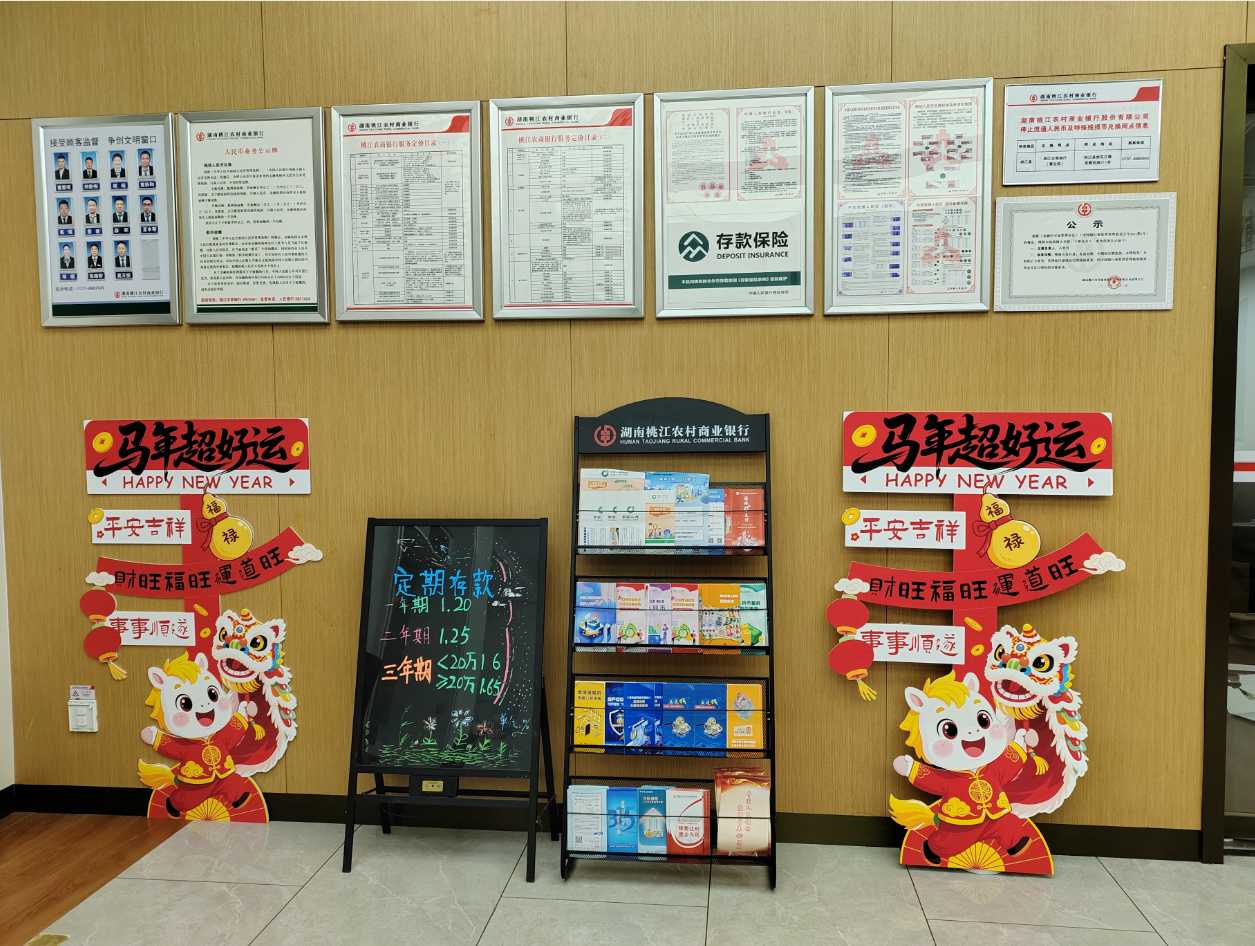 在确保环境整洁规范的基础上,桃江农商银行在客户等候区、业务办理区、产品展示区等关键区域进行了主题化装饰。等候区增设春联、福字、窗花等新春元素,配备老花镜、便民雨伞等暖心物资,安排专人提供引导协助,以“看得见、摸得着”的贴心服务,让每一位客户感受到家一般的温暖。