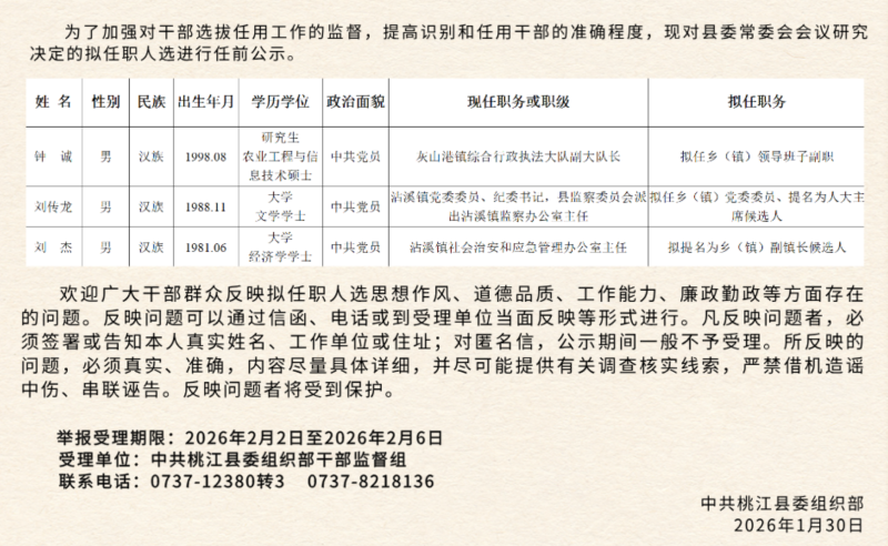 桃江县委管理干部任前公示