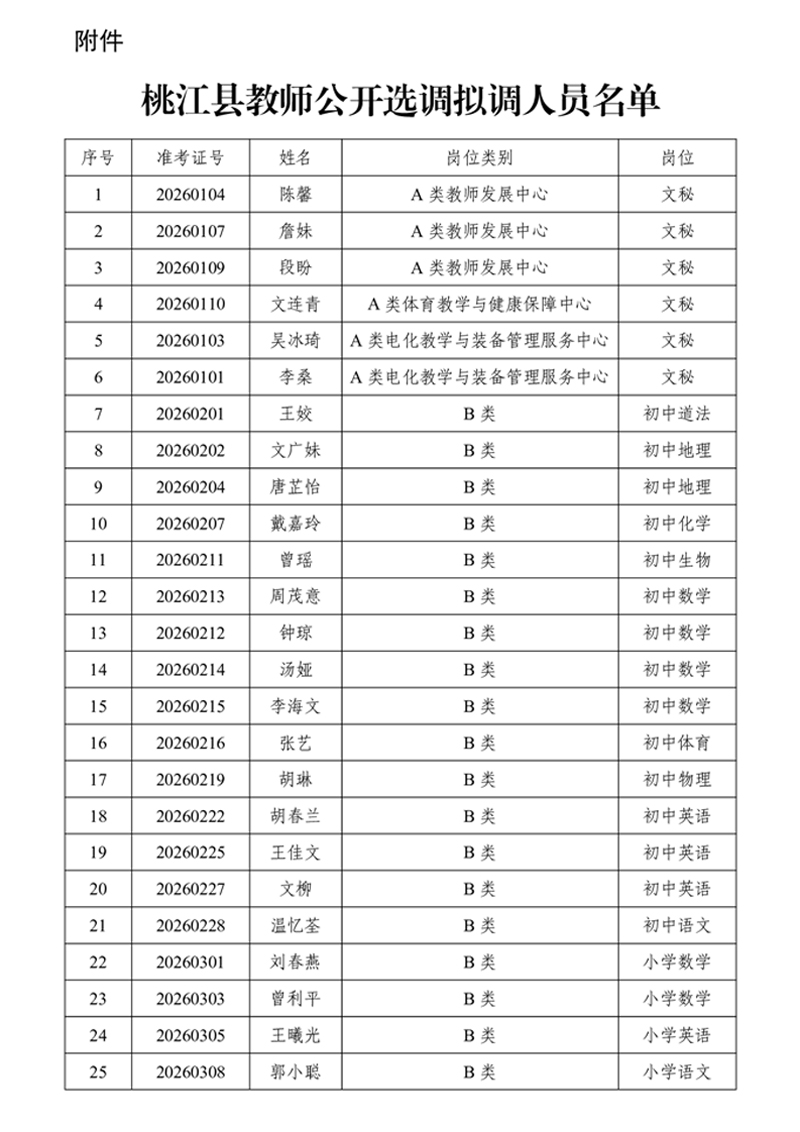 附件(见全文下方):桃江县教师公开选调拟调人员名单