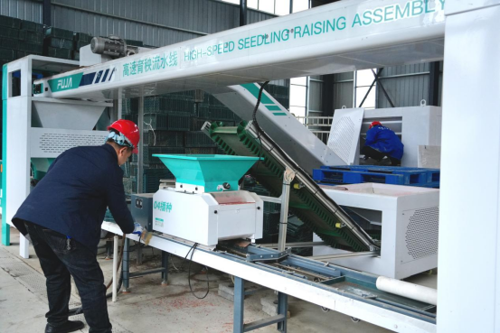 在湖南大队长农业有限公司高速育秧流水线车间,维修工人忙着为设备加注润滑油、清扫灰尘,随着按钮启动,育秧生产线平稳运转,为集中育秧做好准备。