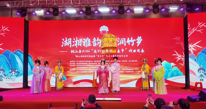 此次活动由县委宣传部、县文化旅游广电体育局指导,县文联主办,通过五大篇章层层递进,勾勒出湖湘戏曲的传承脉络与竹乡文化的独特魅力。在“湖湘雅韵・经典传唱”篇章中,湘剧《沁园春·长沙》等经典选段轮番上演,省市级名家领衔登台,本土演员同台助演,水袖翻飞间尽显传统戏曲的深厚底蕴;“跨界融合·竹旅新篇”篇章则聚焦桃江本土风情,地花鼓《双拜年》等表演将“美人窝”的人文之韵与民俗风情融入剧情,生动演绎了竹乡发展新貌与群众幸福生活,展现了基层戏剧队伍的鲜活创造力。