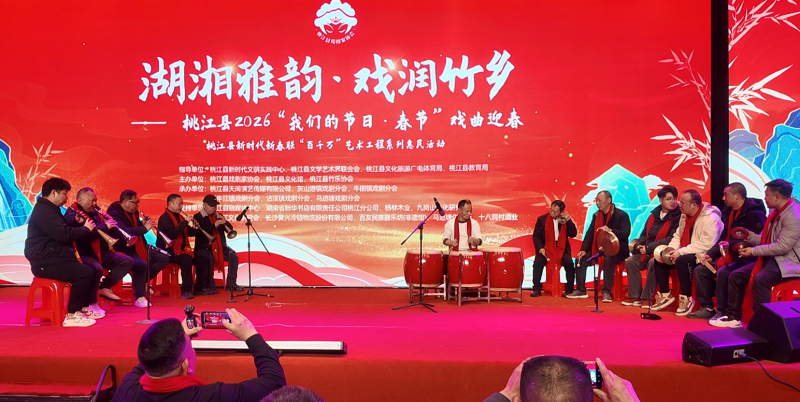2月4日,华美达三楼宴会厅灯光璀璨、弦歌不辍,“浪漫桃花江 竹乡遇见美”2026“湖湘雅韵·戏曲竹乡”迎春活动如期举行。来自省、市、县戏曲名家与基层骨干齐聚一堂,为观众呈现了一场传统与创新交融的文化盛宴。县委常委、宣传部部长林龙飞出席活动。
