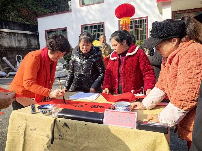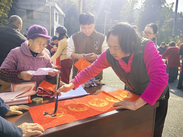 当天上午,村文化广场围满了闻讯而来的村民,大家拿着红纸有序等候,刘上民和一同来的张月华、卢志春、黄艳平三位书法家挥毫泼墨,笔尖游走间,“家和人顺幸福长 马到成功事业旺”“燕语催开千树花 骏马奔腾迎盛世”等吉祥联语跃然纸上。墨香氤氲中,村民的赞叹声、毛笔摩擦红纸的沙沙声交织在一起,红色春联成为冬日乡村最亮眼的风景线。