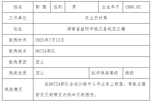 根据《伤残抚恤管理办法》第十条第一款的规定,现将申请人评残有关情况公示如下,在公示期内,如有异议可通过信函、电话或直接到本局反映该申请人相关情况(联系电话:0737-8889771 地址:桃花江镇建设路122号)。