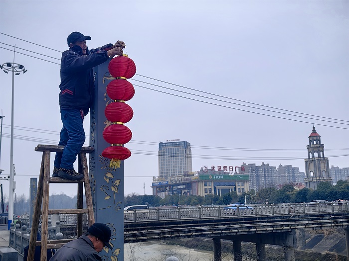 2月3日下午,在县城獭溪河沿江风光带、花苞洲文化广场、金盆广场、金盆转盘等地,市政工人师傅们登高作业,将一串串红灯笼有序悬挂在树木、景观架上。红灯笼错落有致、连成一片。