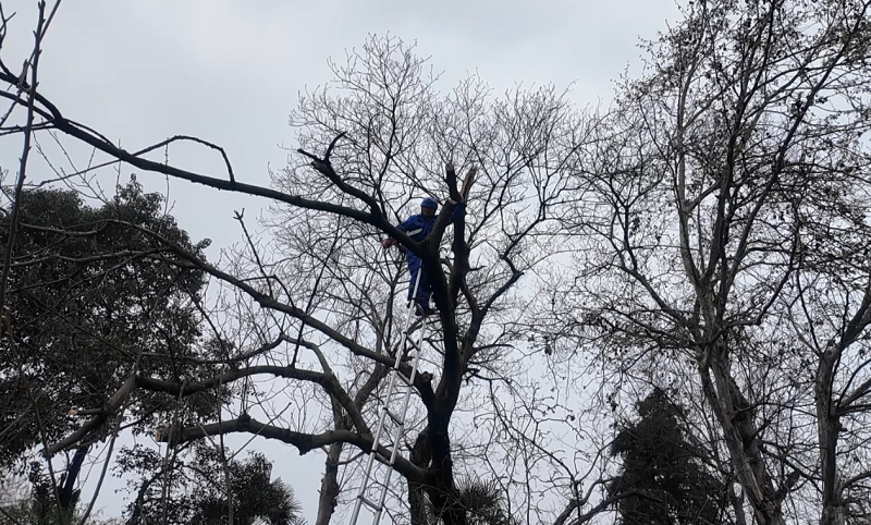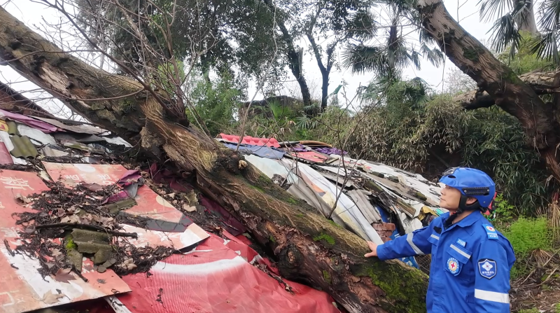 27上午一大早,救援队员携带电锯、绳索、安全防护装备等工具,赶赴居民家中。抵达现场后,救援人员第一时间查看树木倒伏情况、房屋受损程度以及周边环境,并快速划定安全警戒区域。随后,工作人员分工协作,严格按照安全操作规程,对倒伏的谷皮树进行切割、分段清理,小心翼翼地将压在屋顶的树干、树枝逐一移除,防止对居民房屋造成二次损坏。