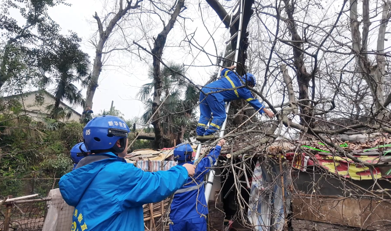 救援队员小心翼翼地移除压在屋顶的树枝。莫斌/摄