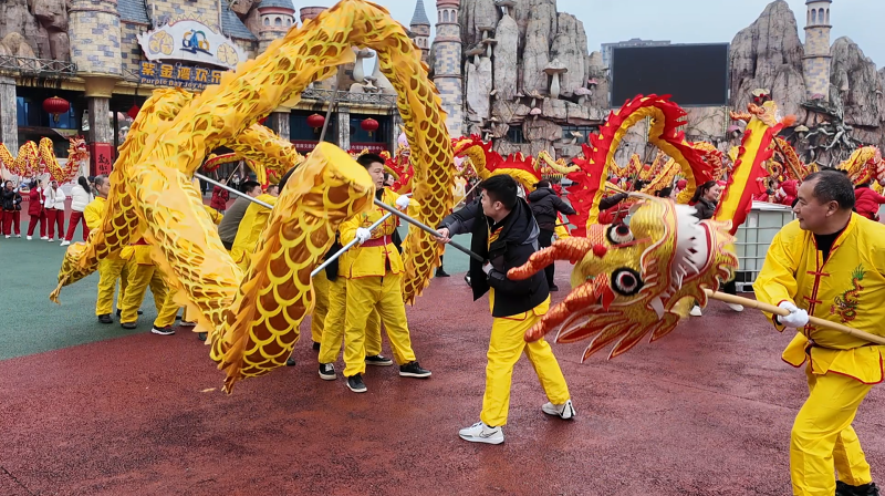 在紫金湾欢乐王国广场,30余支来自全县各乡镇的舞龙队伍正进行全流程彩排。金黄的龙身蜿蜒起伏,队员们精神抖擞、步伐铿锵,随着鼓点节奏灵活挥舞龙杆,金龙腾跃、气势磅礴,将传统民俗的活力与魅力展现得淋漓尽致,为明日的巡游展演做足准备。