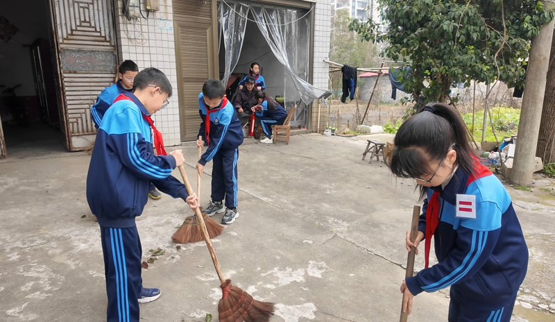 少先队员们为困难党员清扫庭院。莫斌/摄