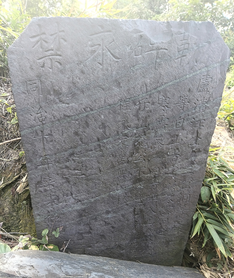 据考证,该碑立于清同治十年(1871年),距今已有155年历史。石碑为青石质地,通高约1米、宽约55厘米。碑额阴刻“勒碑永禁”繁体楷书,碑身竖刻5行正文,详细记载了清代当地关于山林封禁与开采的严格章程:“自山者定以寒露日遵义开山/无山者汝寒露后七日方准入山寻捡/倘敢自进将伊子山充公不贷/越义寿捡鸣团扭送秉公章程/永定万无改移”。石碑石质优良、整体保存完好,仅局部稍有风化。