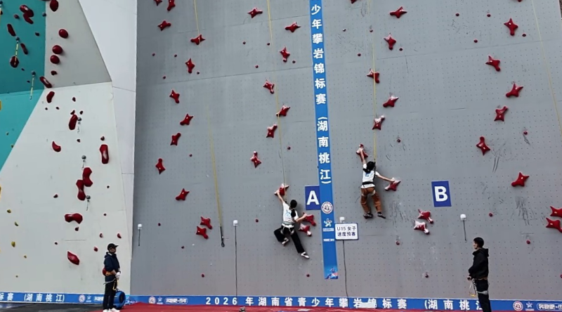 本次赛事由省体育局主办,县人民政府承办,是我省年度规格最高、规模最大的攀岩专业赛事。比赛设难度赛、速度赛、攀石赛、两项全能四大项目,按年龄划分U11、U13、U15、U17四个组别。覆盖男女参赛选手,全面检验全省青少年攀岩竞技水平。同时,本次赛事也是对省运会攀岩项目场地的一次实战检验。赛场依托桃花江竹海独特生态景观打造,自然绿意与竞技赛道相映成趣,“体育赛事+生态旅游”深度融合。湖南省青少年攀岩队领队田璐对场地条件给予了高度评价:“这里的岩壁造型丰富,支点布局科学,尤其是户外场地的开阔视野,非常有利于运动员发挥出最佳水平。”