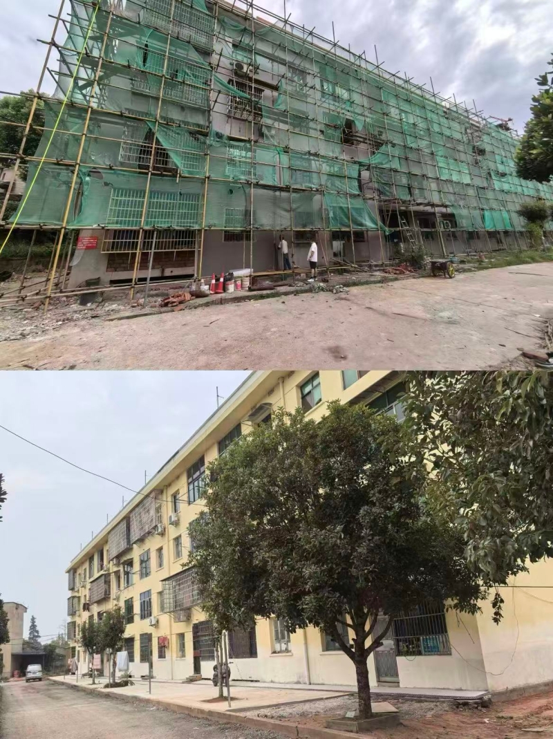 了解到情况后,县住房保障服务中心迅速制定维修加固方案,于2025年6月正式启动对两栋住宅楼进行结构加固、屋顶防水、外墙防渗、道路平整、排水系统升级等全方位改造,至今年4月全面完工。