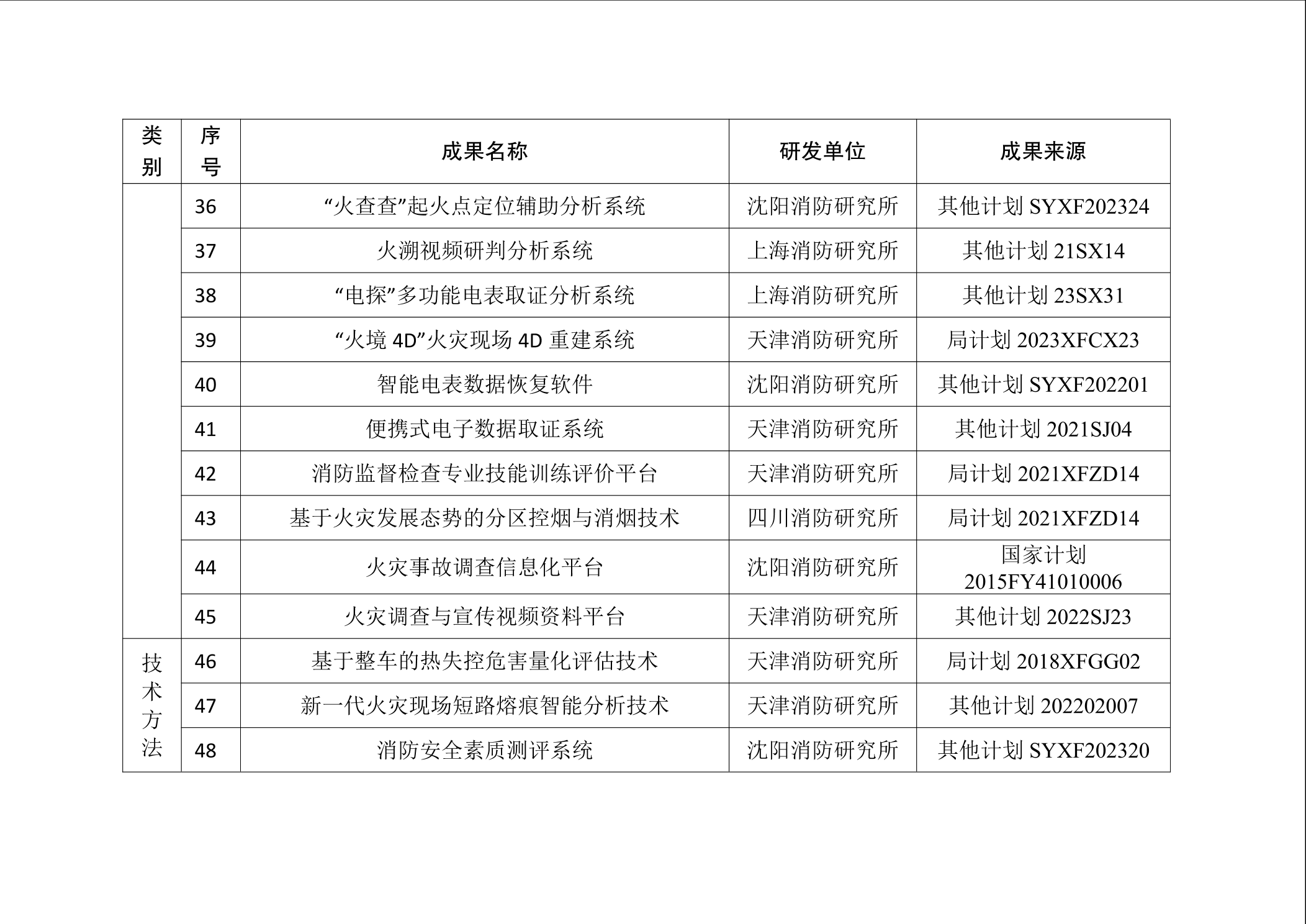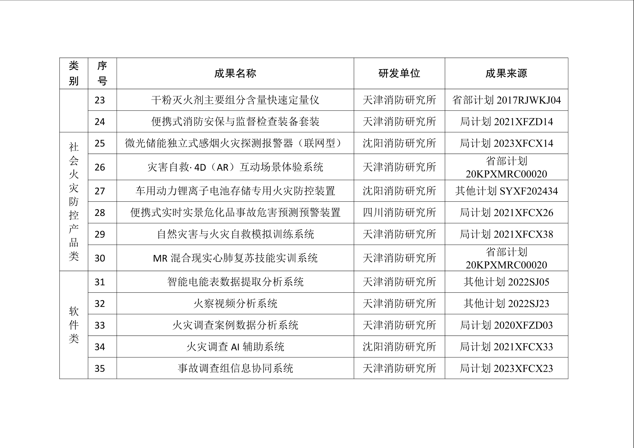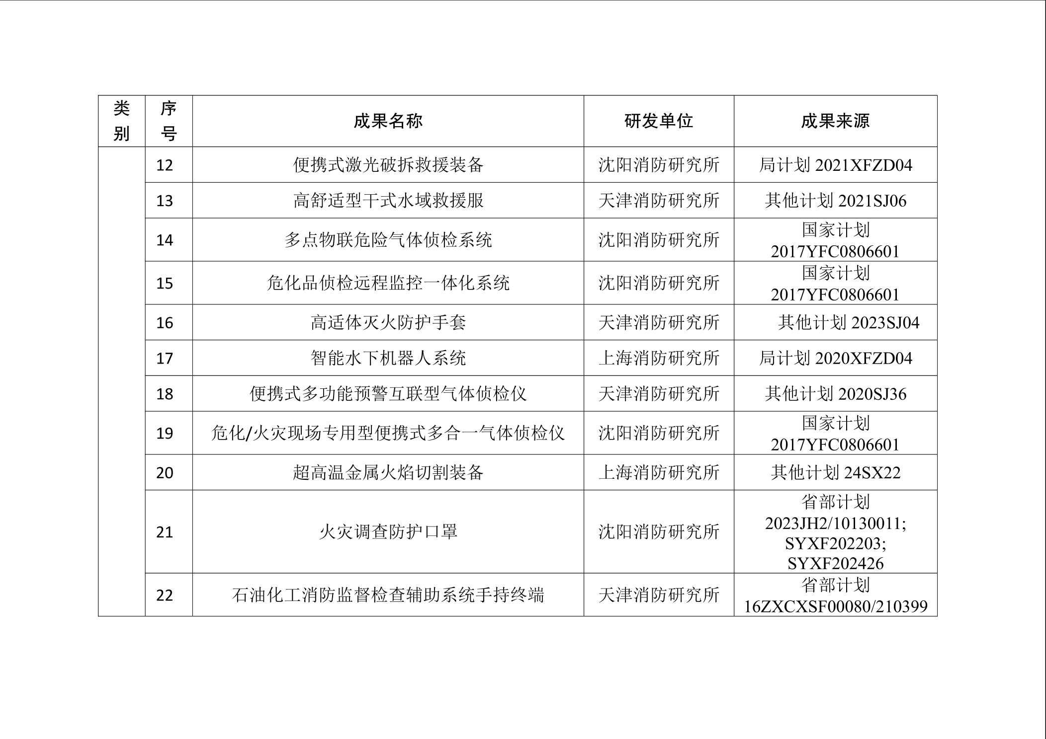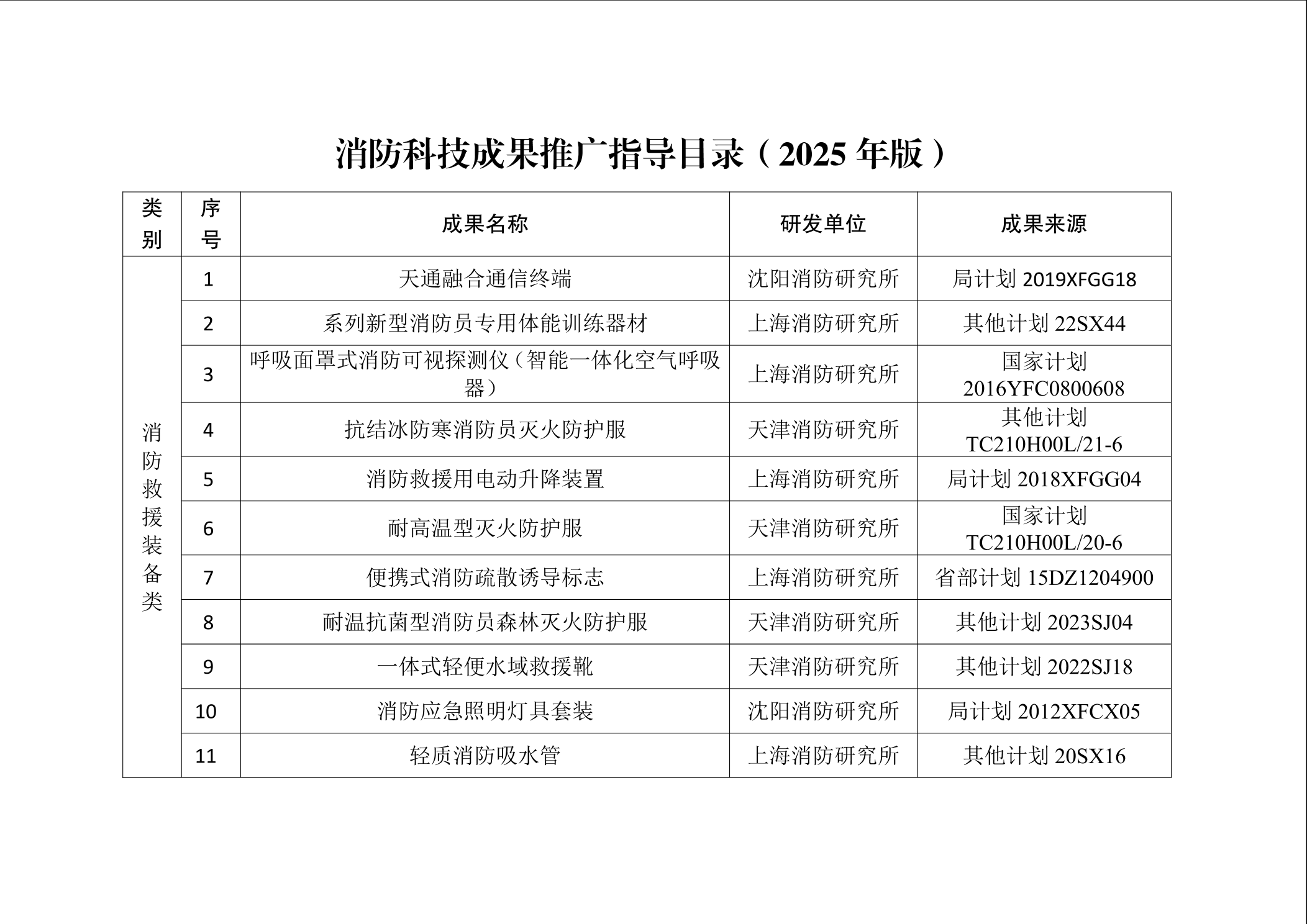 为加强消防科技成果的宣传推广工作,促进科技成果提升新质战斗力,按照《消防救援局科技成果推广应用管理办法(试行)》,国家消防救援局组织专家在各级科技计划项目研发的成果中,遴选出技术水平先进、实用性较强、具有推广价值的科技创新成果,现将消防科技成果推广目录予以发布(见附件)。