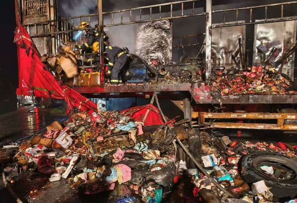 消防救援人员抵达现场后经勘察询问发现,火势正处于发展阶段,起火点为轮胎部位,由于车内装载大量百货商品,火焰引燃货物已迅速蔓延,现场浓烟滚滚,如不及时扑救将会形成大面积燃烧。根据现场情况,指挥员立即下令铺设两支水枪,分别从两侧对火势进行夹击压制。经过近一小时的紧张扑救,明火被成功扑灭。所幸事故未造成人员伤亡。随后,消防救援人员对现场进行了全面清理,在确认无复燃危险后收整归队。