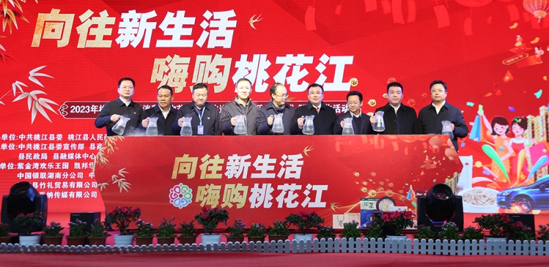 2月4日下午,“向往新生活 嗨购桃花江”2023桃江县首届消费购物节暨“文化进万家 欢乐闹元宵”群众文化活动启动仪式在紫金湾欢乐王国举行。副市长杨智华出席,县委书记向荣致词,县委副书记、县长周登高主持,县人大常委会党组书记、主任伍令贤,县政协党组书记、主席杨凯波,以及县四大家在家县级领导出席。