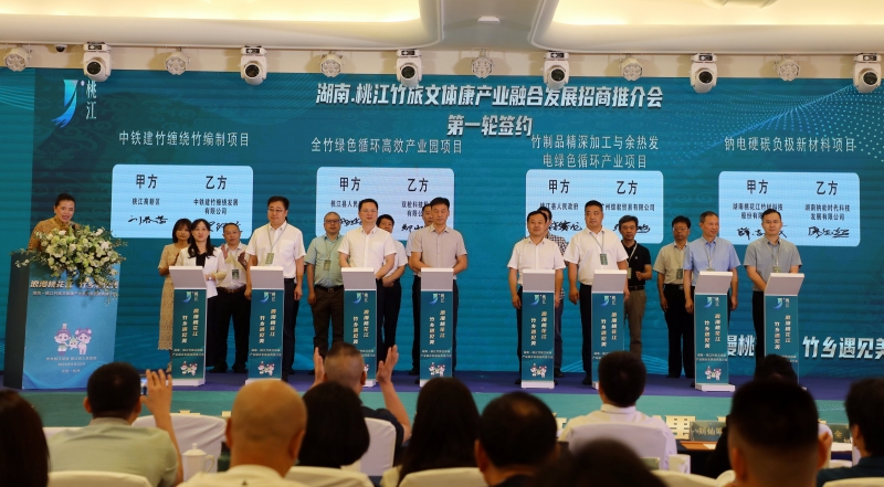 推介会上,桃江与双枪科技、中铁建、钠能时代等10家企业的10个重点项目集中签约,总金额达10.4亿元。其中,双枪科技规划在马迹塘笋竹产业园用地120亩,建设全竹绿色循环高效产业园项目,实现对笋、竹价值的全利用;中铁建集团规划在桃江高新区建设竹缠绕竹编制项目。