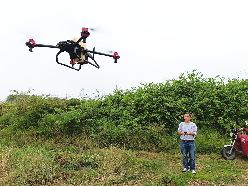丁良在操作植保无人机进行农药喷洒作业 袁静 摄