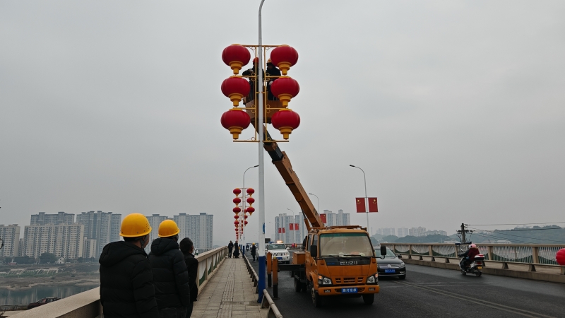 工作人员正在牛潭河大桥悬挂灯笼 刘治安 摄