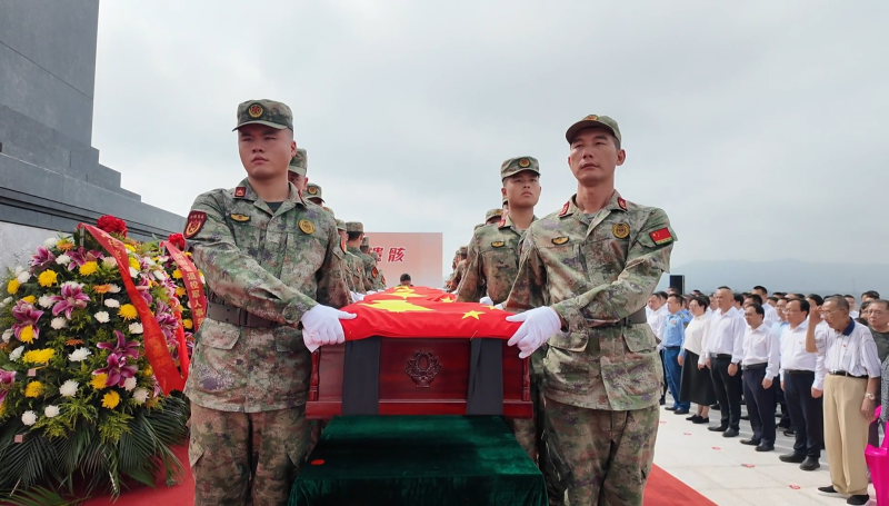 上午10时30分,马迹塘战役烈士纪念园内松柏苍翠、哀乐低回,县委常委、宣传部部长林龙飞宣布烈士遗骸安葬仪式正式开始。22名礼兵稳稳托起覆盖国旗的烈士棺椁,迈着缓慢而坚定的礼步,在《思念曲》中,将烈士遗骸安葬。参加安葬仪式的人员神情肃穆,共同见证这一庄严时刻。