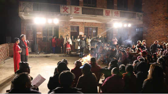 夜幕降临,演出还未开始,村民们陆续聚拢在文艺屋场活动现场,围着篝火,翘首以盼。