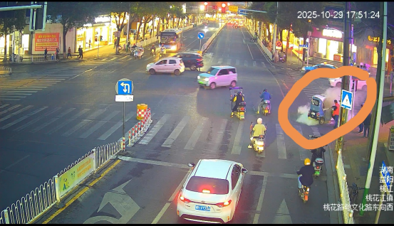 附近的监控显示,当天下午5点48分许,正值交通晚高峰。一辆“老头乐”电动车在行至桃江县城十字街路口时,车主匆忙下车,随后车座处便开始不断冒出刺鼻的浓烟。此时,刚结束文明劝导工作、正准备下班的县交通运输局综合行政执法大队二中队副中队长王苗苗见状,毫不犹豫地冲向现场。