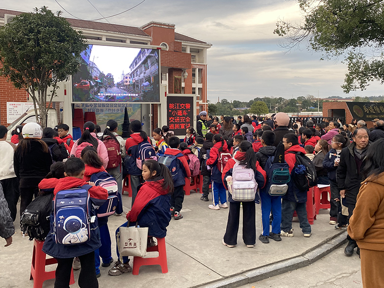 11月18日下午,正值马迹塘镇小学放学高峰,校门口人头攒动。交警三中队的“小篷车”准时停靠在学校周边安全区域,车载屏幕循环播放交通安全警示教育片。画面中,未戴头盔、非法安装遮阳伞具引发的交通事故案例触目惊心,吸引了接孩子的家长和过往群众驻足观看。民警一边发放宣传资料,一边现场讲解:“骑摩托车、电动自行车带孩子,一定要把头盔戴好扣紧,遮阳伞会影响操控,遇到大风容易翻车,千万不能装!”同时提醒家长和学生,要自觉遵守交通规则,不逆行、不闯红灯,远离大货车盲区,筑牢出行安全防线。