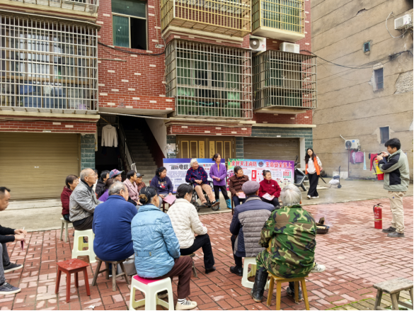 一大早,川门湾社区召集居民开屋场会,向居民们发放了《家庭用火用电安全宣传单》,介绍了消防安全的重要性,强调家庭用火用电切不可掉以轻心。随着冬季到来,在室内烤火时更要注意预防小火亡人和一氧化碳中毒。随后,工作人员在现场进行了灭火器教学和实操演练,向居民们介绍干粉灭火器如何识别是否已过期以及使用步骤,并现场演示了“提、拔、握、压”四字口诀的操作要领。现场居民们纷纷表示,“灭火器见过,就是不知道如何使用,今天经过演示,发现挺简单的。”