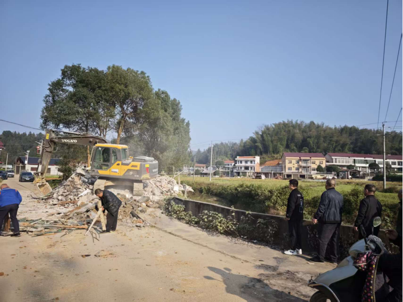 11月14日,武潭镇汤家塅村一栋严重受损的危旧房屋被顺利拆除。
