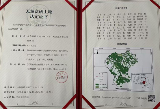 近日,中国地质学会公布第五批天然富硒土地认定结果,高桥镇天然富硒地块以8万余亩的土地规模、1.55mg/kg的平均硒含量成功入选,全国同批地块硒含量最高、湖南省同类型认定面积最大,是益阳市目前唯一被国家级认定的天然富硒地块。