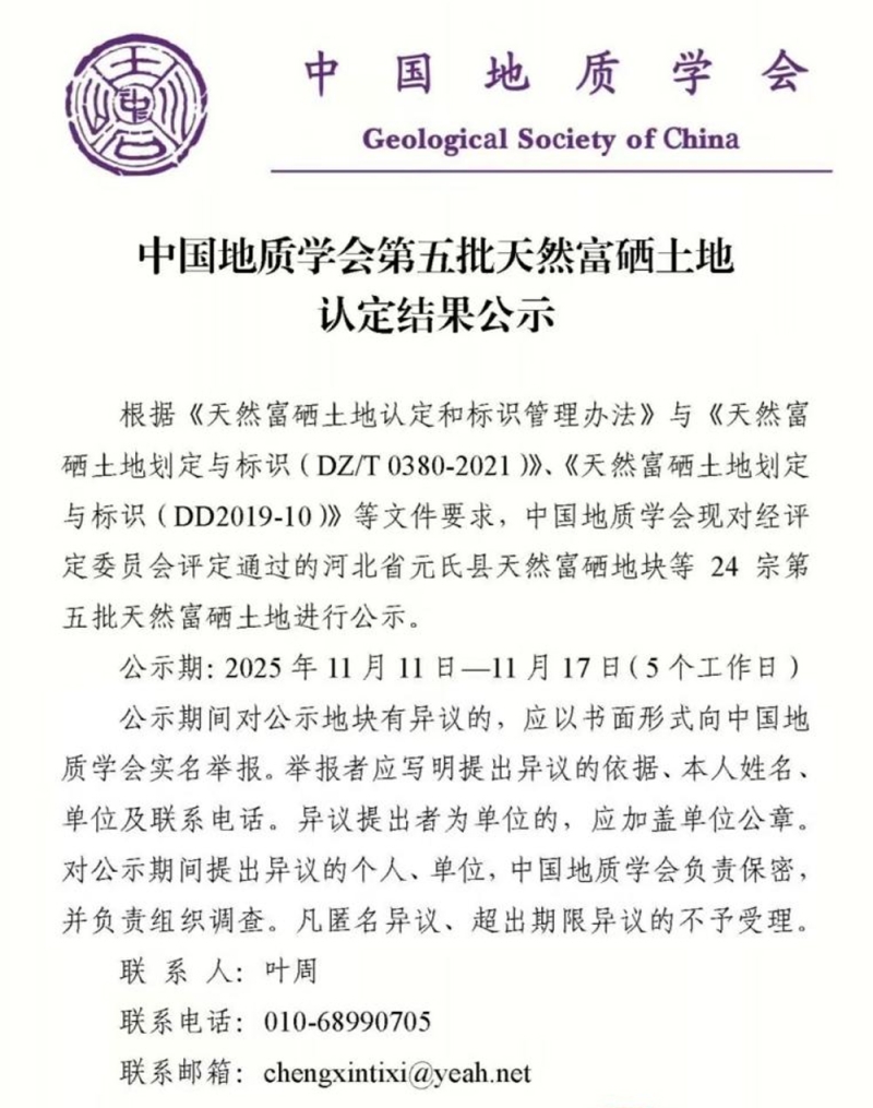 中国地质学会第五批天然富硒土地认定结果公示截图