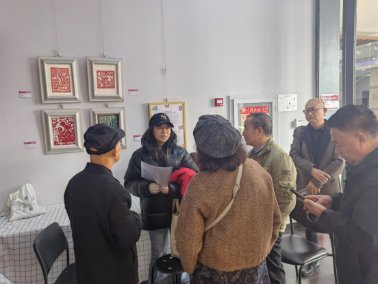 在京师美术馆,Vikki Han(韩惠欣)(左二)向颜新元教授(右三)和桃江剪刻艺术家交流剪刻艺术 汪术 摄