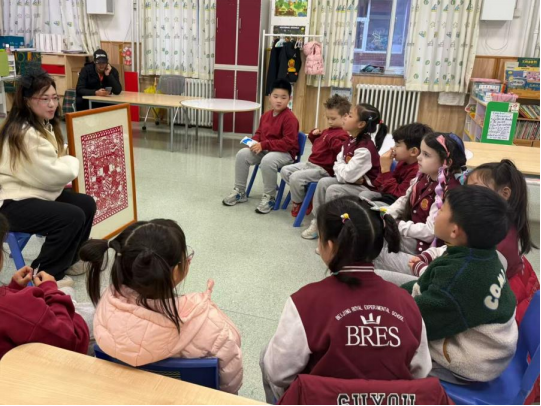 课堂上,我带来的另一件“法宝”,便是那本荣获“中国好书”等大奖的绘本——《妈妈的剪影》。他的作者是一对母女,母亲叫刘雪纯、女儿叫弯弯,她们在美丽的桃花江土生土长,是从小就喜爱的剪刻艺术伴随她们成长,从乡下到县城、省城,一直到北京。我动情地告诉孩子们:“这本书里的剪纸,源自桃江这片热土,它承载着一位母亲的生活印记,也凝聚了一个地方的千年文脉。”当孩子们的小手轻轻抚过书页,好奇地追问时,我深深感到,美好的文化自有直抵人心的力量。当孩子们认真的看着艺术家汪术先生的《喜庆》作品时,文化传承的种子正悄然在这座国际化校园里播种。