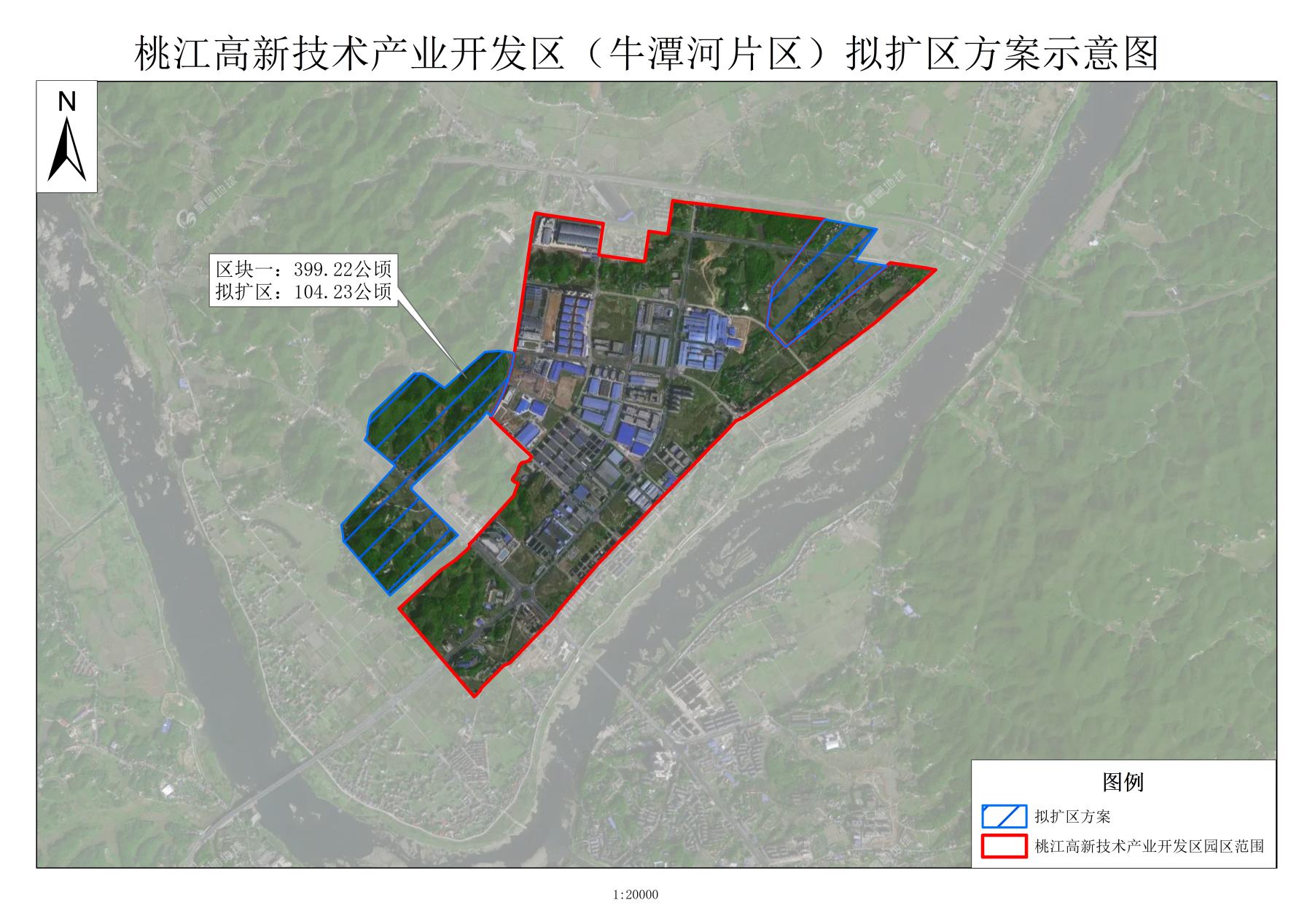 区块一:原边界范围399.22公顷,拟扩区面积104.23公顷,扩区后总用地面积503.45公顷。四至范围:东至资江,南至桃兴路,西至桃迎路,北至长石铁路桃花江站。