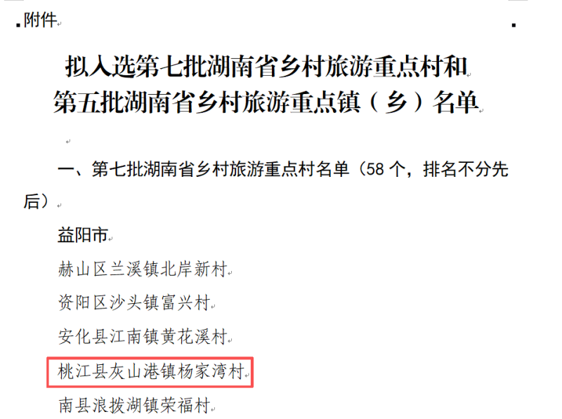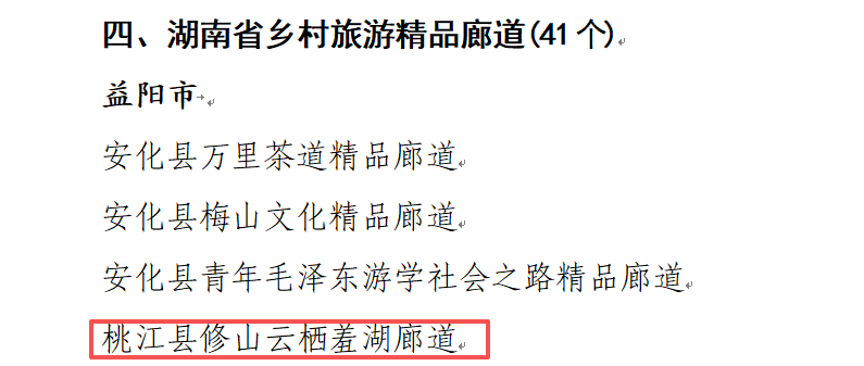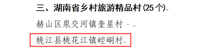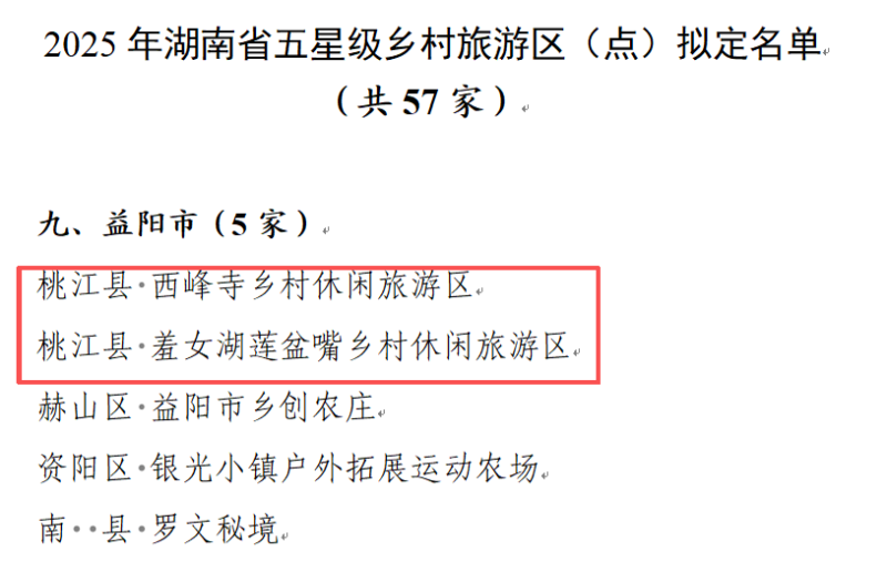 近日,湖南省文化和旅游厅公示第七批乡村旅游重点村镇、2025年“四个一百”工程及五星级乡村旅游区(点)名单,桃江县共有6个项目入选,数量约占益阳市入选总数的半数,体现了我县在乡村旅游发展中的示范作用。