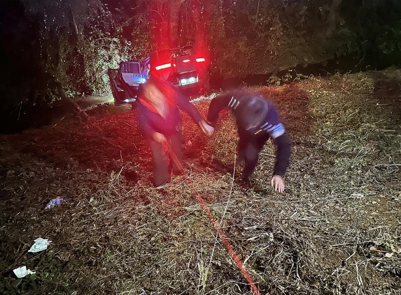 警情就是命令!交管大队事故处理中队民警接到派警指令后,立即驱车火速赶往现场,途中同步拨通报警人电话,详细询问人员伤势、车辆位置等关键信息,为救援争取时间。抵达现场后,民警何鑫发现救护车医护人员已先期到达,但土坡下的水渠中未见伤者身影。眼前的土坡高达二十余米,陡峭程度接近60度,夜间视线昏暗,坡面杂草丛生且湿滑难行,给救援带来极大挑战。“有人吗?能听到吗?”何鑫趴在土坡边缘大声呼喊,却未得到回应。想到驾驶员突发急症,此刻意识模糊、呼吸不畅,每一分每一秒都关乎生命安危,何鑫心急如焚。得知同行的一名当事人家属具备救援经验,两人当即决定先行下去施救。